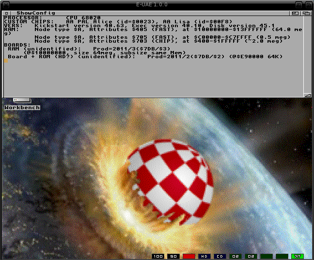 Pour être totalement sûr de mon coup, je lance AlienBreed 3D avec E-UAE sans le JIT… Outch, que c’est lent, je ne sais même pas si j’atteins les 5 FPS… Comparons avec la version JIT… Nom de Zeus ! C’est fluide, probablement pas très loin de 30 FPS ! Et le résultat est encore plus saisissant avec AlienBreed 3D II qui est enfin jouable ! Ce qui est étrange, puisque la DEL (oui Diode Électro Luminescente en bon françois, ou bien LED si vous préférez…) dédiée au JIT reste rouge, ce qui signifie que celui-ci n’est pas activé… Étrange, et surtout tout bonnement incroyable. Le constat se répète avec d’autres FPS comme Breathless. Bien évidemment, le JIT ne permet pas de faire des miracles puisqu’il ne fonctionne qu’avec un processeur 68020 et plus.