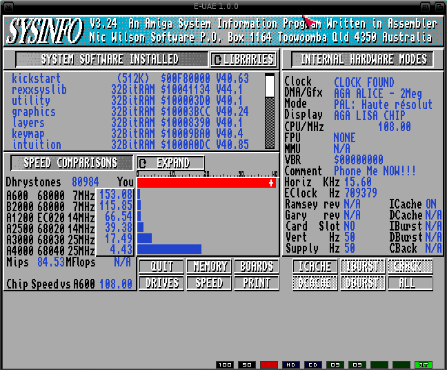 Tout d’abord, sachez que SysInfo, qui permet d’avoir quelques informations sur son Amiga, et qui fait aussi un petit calcul du nombre d’opération à la seconde, donne un processeur 68020 à 10 Mips sans JIT contre un processeur 68020 à 88 Mips avec le JIT ! La différence entre les deux est, par conséquent, déjà plus qu’évidente sur mon PowerBook G4 à 1,67 GHz. Pour ce qui d’un Mac Mini G4 à 1,33 GHz, celui de ACE pour ne pas le citer, il tourne à près de 66 MIPS, ce qui est plus qu’honorable et ce qui rend le tout enfin utilisable.